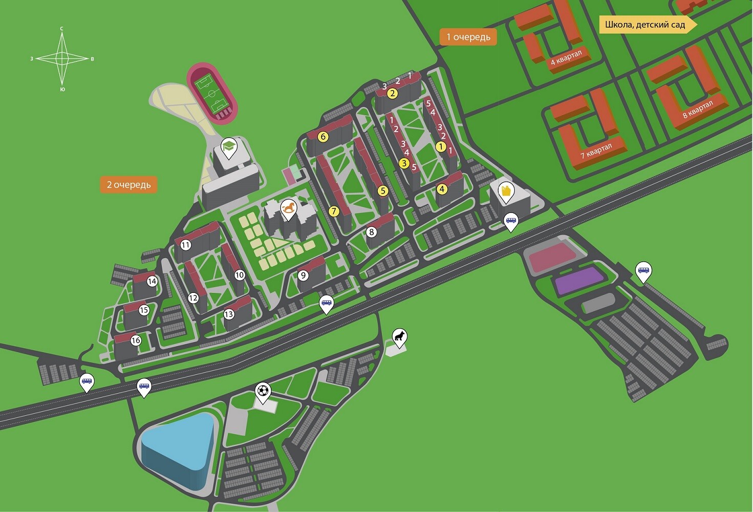 Объекты социальной инфраструктуры возводятся муниципалитетом, посредством включения в соответствующие городские программы социально - экономического развития. На фото представлена примерная визуальная концепция, реальный вид объектов может отличаться.
