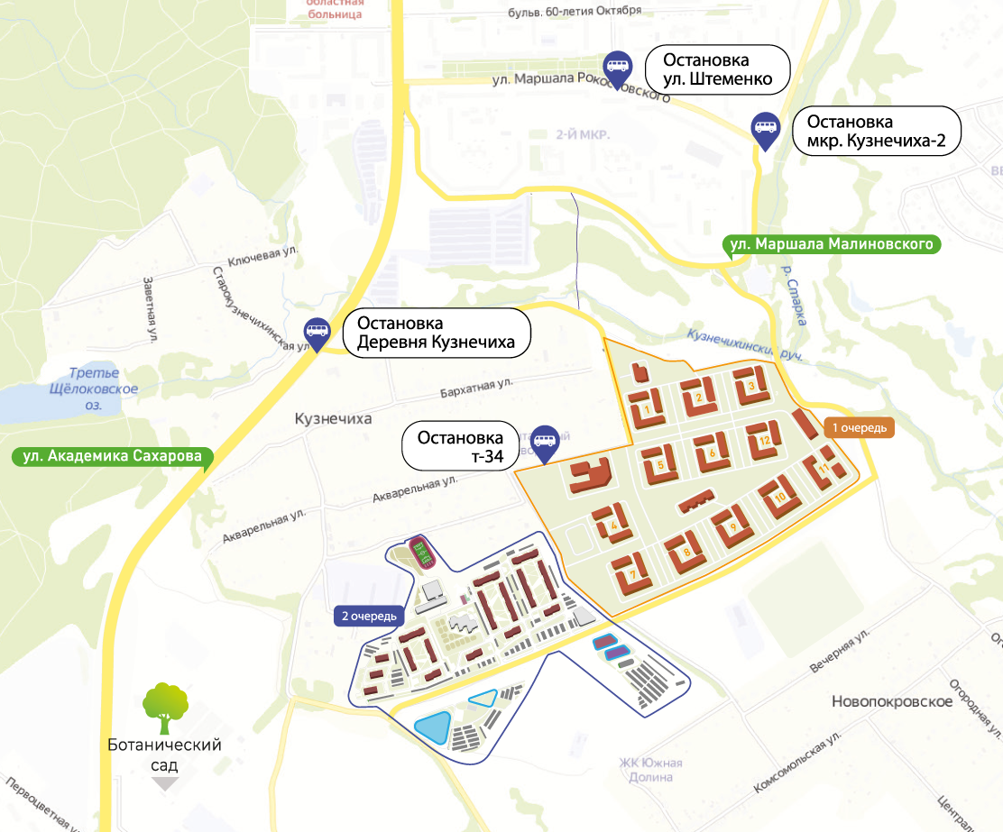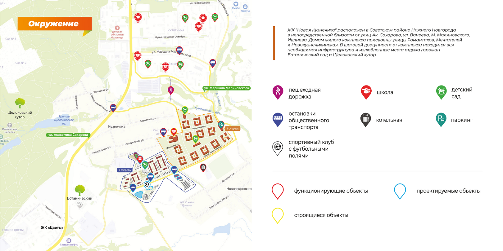 Жилой комплекс «Новая Кузнечиха» расположен в Советском районе Нижнего Новгорода рядом с двумя излюбленными местами отдыха – Ботаническим садом и Щелоковским хутором.