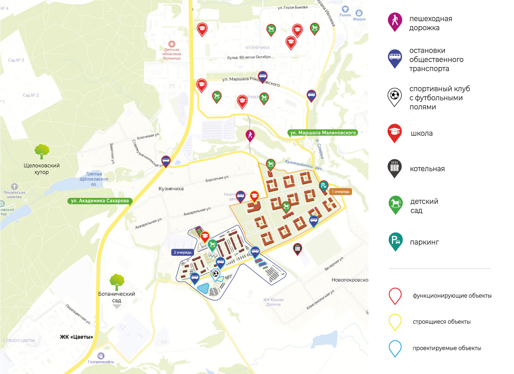 Это действующий, тихий, комфортный, экологичный район, в 10 минутах от делового центра, со своей развитой инфраструктурой, хорошей транспортной доступностью и местами для отдыха.