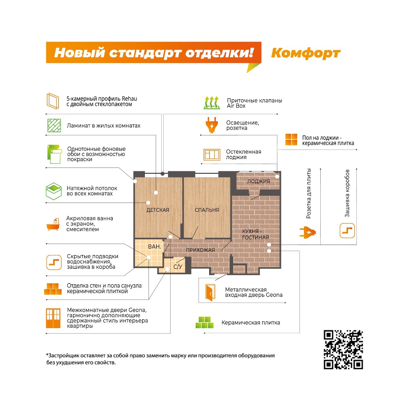 Квартиры сдаются с чистовой отделкой, выполненной с использованием современных, безопасных, экологичных и долговечных материалов высокого класса.